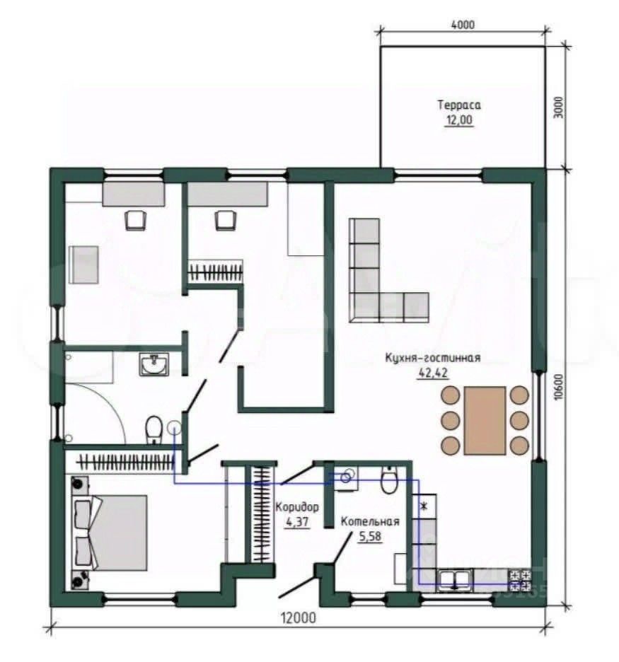 Особенностью дома является принцип его проектирования. При планировке мы увеличили площадь основных комнат за счет уменьшения технических и связующих помещений.
