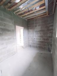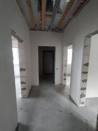 Дом с отделкой под чистовую, на полу полусухая стяжка с утеплением 50мм, стены оштукатурены.