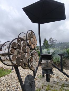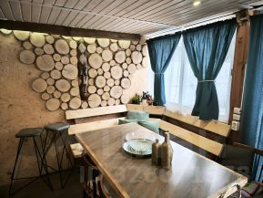 . беседка (из бруса, крыша профлист, большой стол, лавка, стена с подсветкой из срезок березы, кухонная зона с канализацией и горячей водой, вытяжка, большой камин-мангал из кирпича, панорамная дверь)