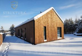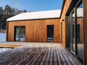 Этот дом — настоящая жемчужина архитектурного искусства. В нём органично слились благородство линий и природная теплота материалов: фасад, облицованный планкеном, притягивает взгляд своей изысканной простотой, а панорамные окна в чёрных рамах добавляют облику современности. Внешний облик дома не оставит равнодушным: одноэтажное строение с продуманной сложной кровлей из металлочерепицы и надёжной водосточной системой сочетает эстетику и практичность. Панорамные окна с мультифункциональными стеклопакетами не просто украшают фасад — они надёжно защищают от холода и шума, щедро наполняя комнаты солнечным светом.