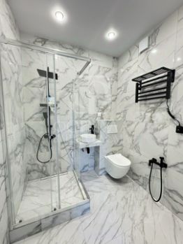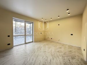 На полу керамогранит, на стенах обои, межкомнатные двери, натяжные потолки со светильниками, в санузлах плитка, установлена полностью вся сантехника, в котельной котел, водонагреватель.