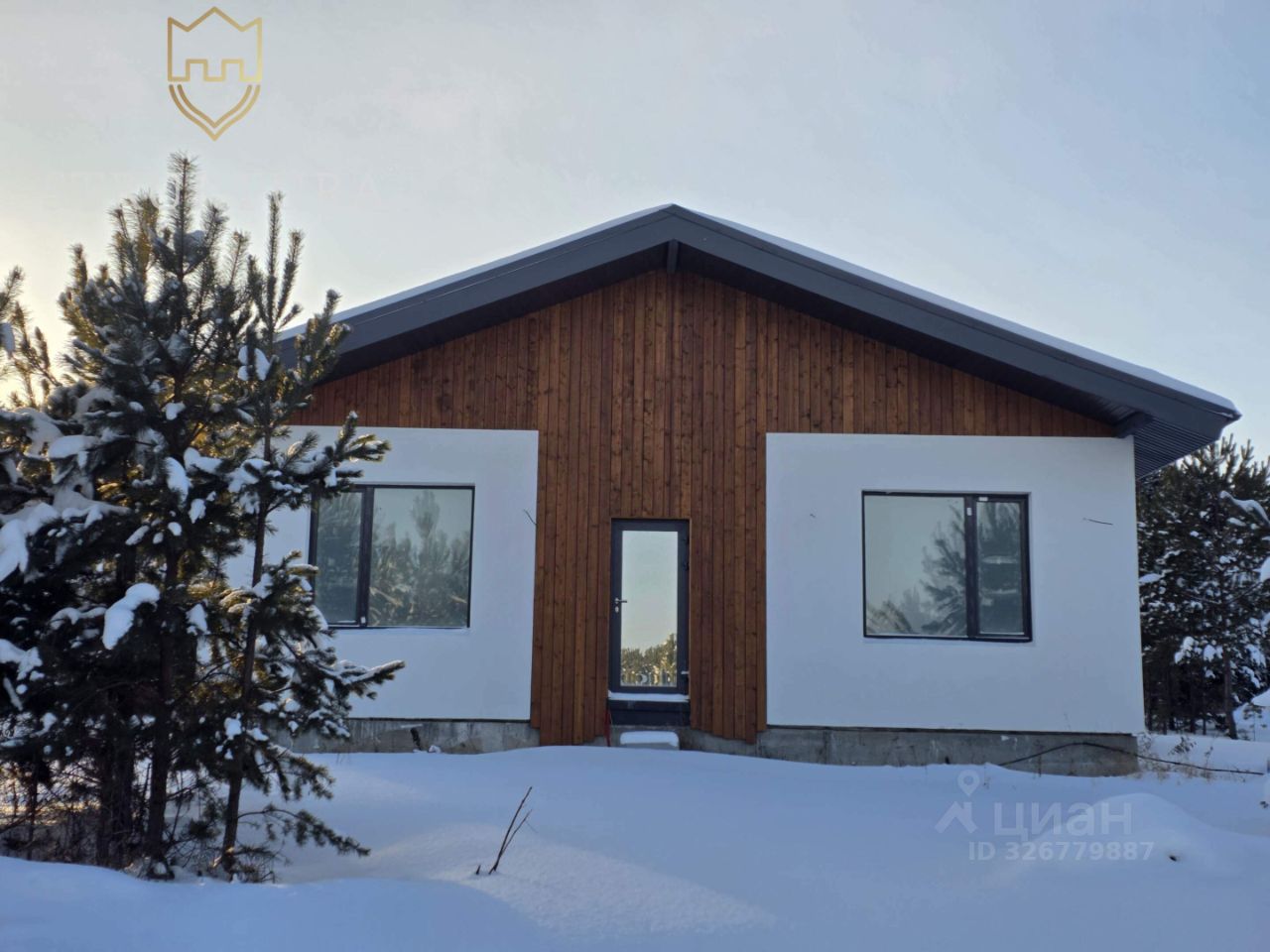 Фасад дома выполнен в светлых тонах и украшен элегантными деревянными элементами. Установлена водосточная система и снегозадержатели, а так же залита бетонная отмостка по периметру дома.