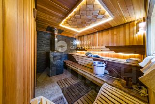 В парилке дровяная банная печь ИзиСтим Геленджик. В душевой автоматическое обливное устройство ИзиСтим Каскад 20 литров. В комнате отдыха кухонный гарнитур, большой диван, обеденная зона.