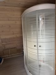 Участок - газон. На участке стоит баня-бочка и есть строительный вагончик для хранения инвентаря.