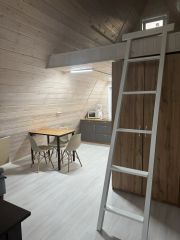 Дом каркасный, на винтовых сваях. 2 этажа. На первом расположена кухня-гостиная, сан узел, на втором спальня. Частично нет межэтажного перекрытия — потолком для первого этажа выступает крыша дома.