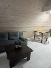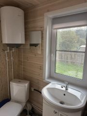 Вода -скважина, заведена в дом на кухню и в сан узел, горячая - через водонагреватель на 50 л, канализация - антисептик, эл-во 220 В.