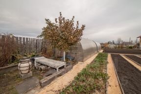 Имеются насаждения: яблоня, кусты смородины, ирга, вишня, слива, малина, клубника.