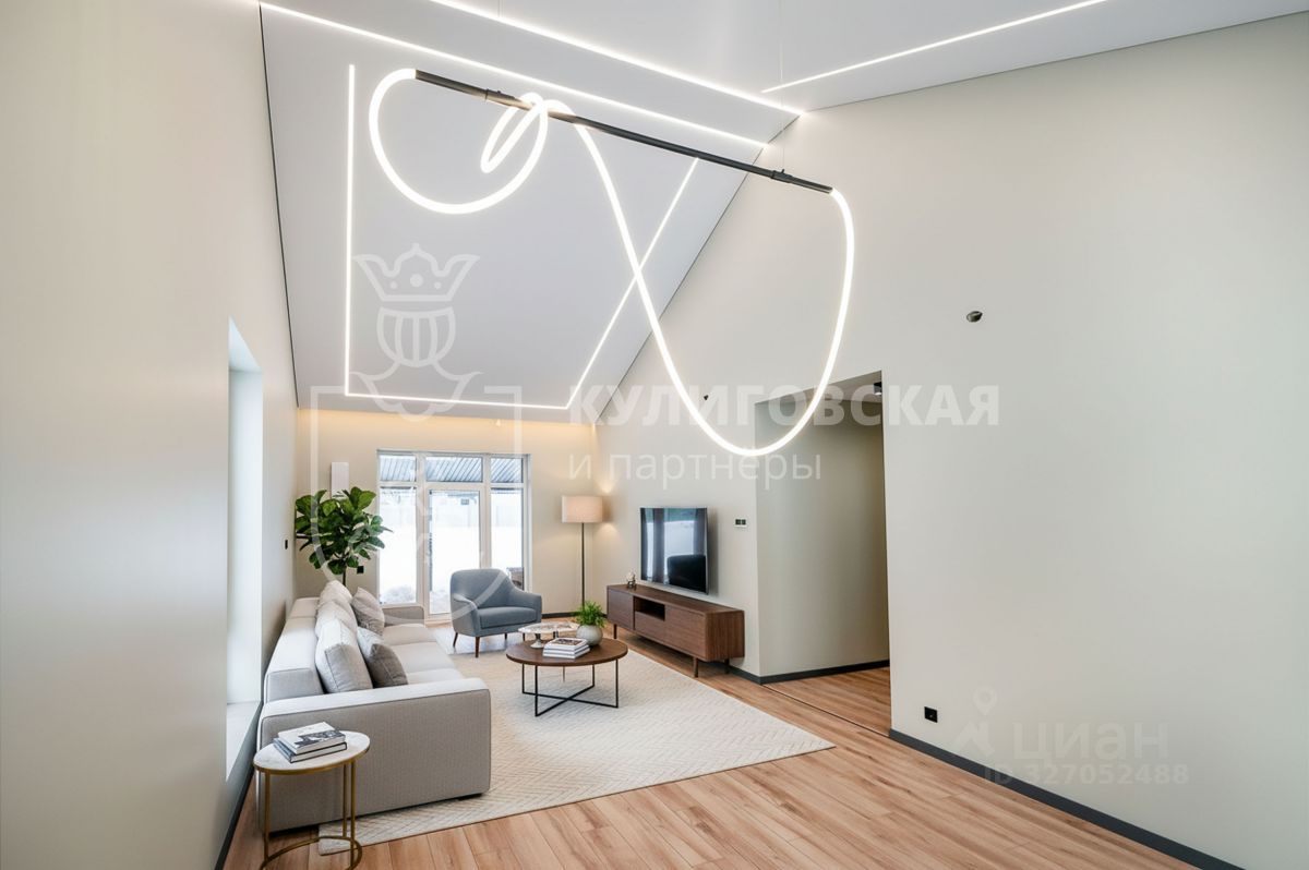 Просторная кухня-гостиная (40 кв. м.) с великолепными потолками высотой 5.5 м. станет сердцем Вашего дома, идеальным местом для семейных ужинов и шумных вечеринок.