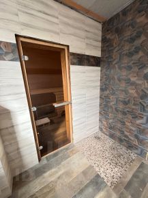 • Баня: комната отдыха со вторым светом, санузел и унитазом, душевой и местом под купель, парная с дровяной печью, Место над парной и санузлом можно использовать как гостевую или игровую комнату;