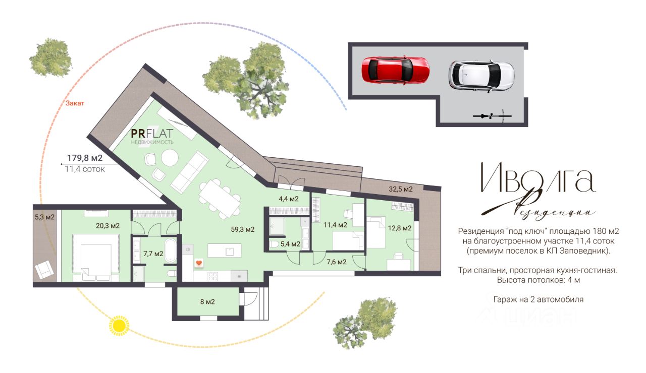 Уникальное предложение. Звоните! В продаже — готовый роскошный дом площадью 180 м² в проекте Иволга Residences (Резиденции Иволга). Иволга — это коллекция из 7 готовых премиум-резиденций, расположенных в приватной части коттеджного поселка Заповедник в Сысертском муниципальном округе Свердловской области. Здесь создан идеальный баланс загородного уединения и городского комфорта. Резиденции граничат с вековым лесом — для прогулок и отдыха, при этом вся инфраструктура поселка — в шаговой доступности: рестораны, магазины, частная школа, спортивные и детские площадки, парк. О резиденции: Площадь — 180 м², высота потолков — 4 метра. Панорамное остекление. Функциональная и продуманная планировка включает: - 3 спальни, включая мастер-спальню, - кухню-гостиную 59 м² с выходом на открытую террасу, - 2 санузла, - котельную с отдельным входом. В меблировке используются натуральный шпон, камень, в отделке санузлов — крупноформатный керамогранит и премиальная сантехника. В доме установлена вся необходимая бытовая техника. Во всех комнатах — теплые полы, а умная система сама поддерживает идеальный климат круглый год. Гараж на 2 автомобиля. Современные инженерные решения во всех домах Иволга Residences: - воздушное отопление с кондиционированием и вентиляцией, - система умный дом, - выделенная мощность э/э 25 кВт, - оптоволоконный интернет, - своя скважина, - газ. Участок площадью 11,33 сотки полностью благоустроен — рулонный газон, озеленение. Организована система автополива. Безопасность. На территории Иволга Residences действует пропускная система доступа. Для въезда — отдельный КПП. Круглосуточная система видеонаблюдения. Иволга Residences — это готовый формат для жизни в гармонии с природой, без компромиссов в вопросах безопасности, технологий и комфорта. Идеальный выбор для тех, кто ценит свое время, статус и приватность. Преимущества работы с PR FLAT недвижимость: + полное и комфортное сопровождение сделки, + индивидуальная рассрочка от застройщика, + ипотека, + трейд-ин или зачет вашей недвижимости, + расчеты и сопровождение сделки через private banking, + профессиональным участникам рынка недвижимости - есть СПП, + индивидуальный просмотр в удобное время. Комментарий представителя. Меня зовут Наталия Сидорова, я отвечаю за продажу данной резиденции. Свяжитесь со мной, чтобы получить консультацию, договориться об индивидуальном просмотре, обсудить условия покупки. Звоните — с удовольствием отвечу на все вопросы.