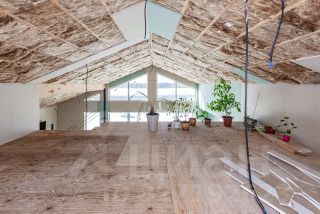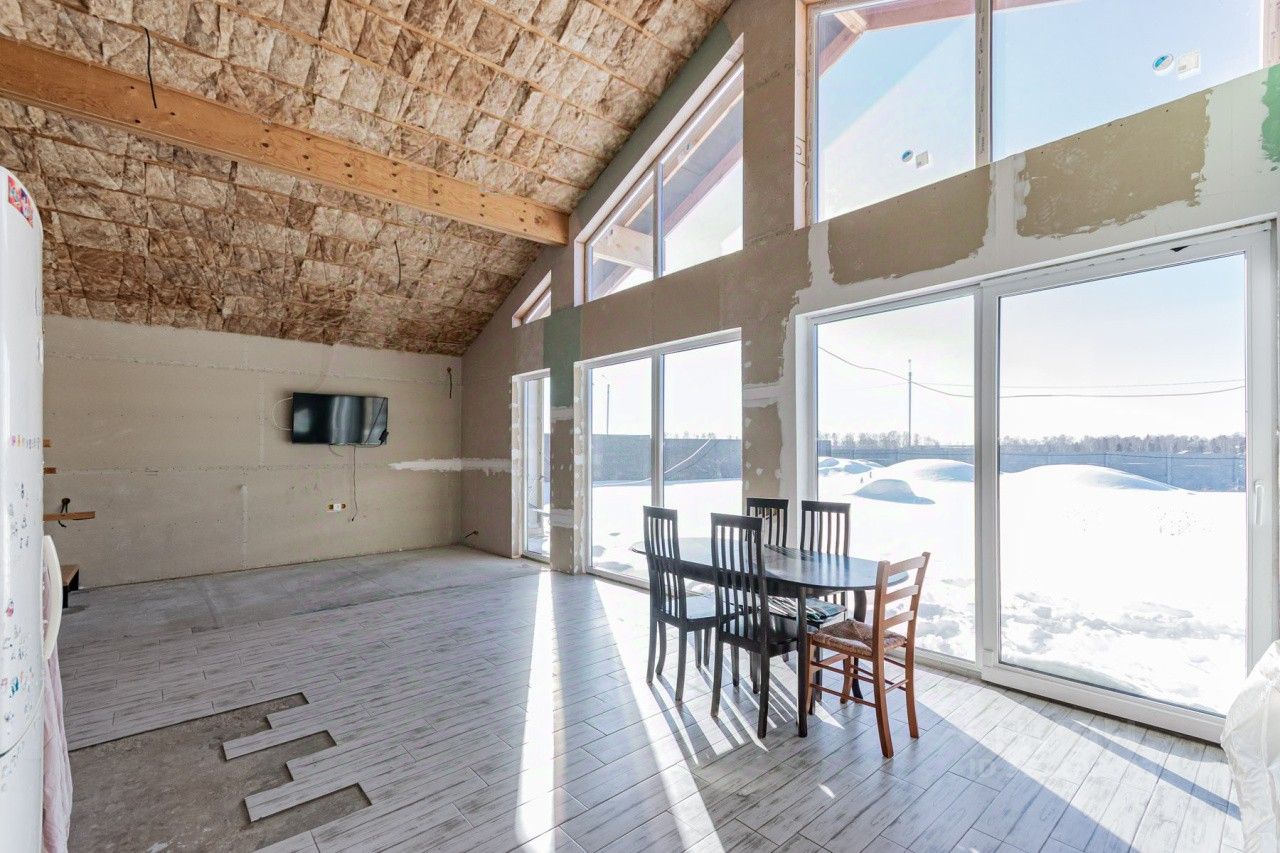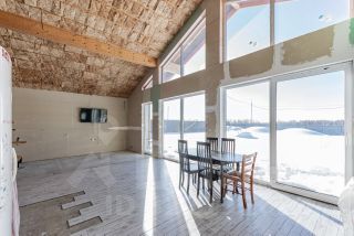 Кухня-гостинная со вторым светом высота 5,5 м с выходом на террасу, с панорамными окнами во всю стену видом на закат.