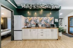 Мебель и бытовая техника: кондиционер, холодильник, индукционная плита, микроволновая печь, электрочайник, кофеварка, пылесос, водонагреватель, светильники потолочные и настенные, фен, утюжок.