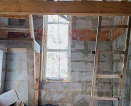 * Площадь: 95 кв.м (69); Этажей: 2, второй - мансардный с эркером. Этап строительства: возведены стены и кровля, без утепления;