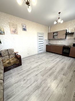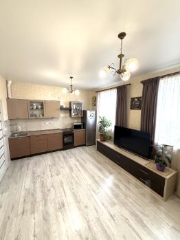 Просторная кухня-гостиная с двумя большими окнами. Света очень много.