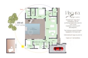 - кухню--столовую-гостиную 48,4 м² с выходом на открытую террасу и собственный водоем,
