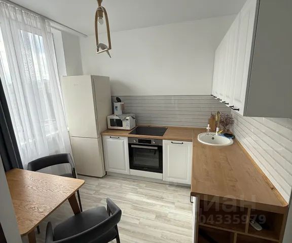 . зона кухни с плитой, холодильником, микроволновкой, чайником, необходимыми кухонными принадлежностями и посудой