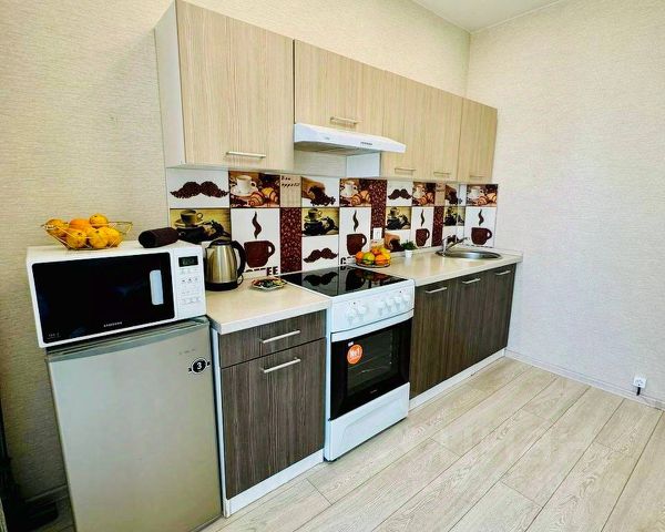 Функциональная кухня оснащена всем необходимым для приготовления и приёма пищи. Здесь комфортно можно разместиться за большим столом, в том числе на удобном диване.