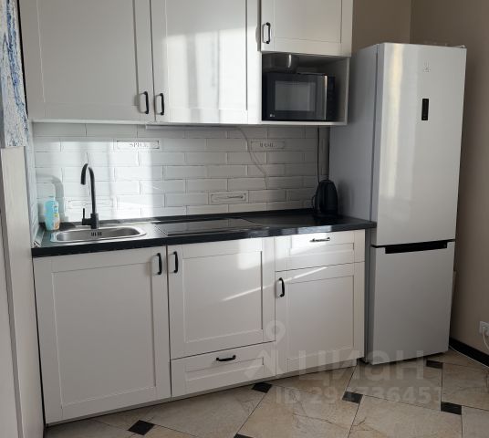 Студия расположена на 20 этаже, окна выходят во двор. В квартире установлены кухонный гарнитур, холодильник, стиральная машина, варочная панель, стол, стулья, диван, стеллаж со шкафом, а также прихожая со шкафом. В санузле находится ванна. В квартире никто не жил, поэтому многое новое.