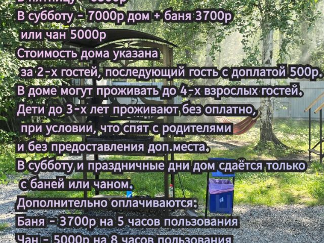Просторный гостевой хороший дом (63 м2) с горячим банным чаном — идеальный вариант для аренды! Этот уютный дом расположен в живописном месте в 30 минутах езды от Екатеринбурга, 15 минутах от Верхней Пышмы и идеально подходит для отдыха и релаксации. В доме есть всё необходимое для комфортного проживания и приятного времяпрепровождения. K вашим услугам: - Большая кухня-гостиная; - две отдельные спальни с большими кроватями; - Постельное бельё и полотенца по количеству проживающих; - санузел с душевой кабиной; - Чан на территории дома; - просторная летняя веранда с мангальной зоной; - Wi-Fi мощный; - ТВ-плазма; - микроволновая печь, варочная поверхность; - посуда на 6 персон, посуда для приготовления еды, чайник; - холодильник, а также фен, утюг; - Большая огороженная территория 10 соток; - Мангальная зона + костровая — позволит вам наслаждаться отдыхом на свежем воздухе; - Банный чан — поможет вам расслабиться после трудового дня и прийти в ресурсное состояние (оплачивается отдельно). Ранний заезд/выезд только по согласованию с менеджером, с доплатой не менее 10% от общей стоимости бронирования/1 час. Горячий банный чан — 4000 ₽/одна топка (до 4-6 часов тепла). Горячий банный чан с еловыми веточками и грейпфрутом — 5000 ₽/одна топка (до 4-6 часов тепла). Чан разогревается к 20: 00-21: 00, возможно подготовить только в первый день заселения. В зимний период времени вода в банном чане может прогреваться только до 35-39. Халат (аренда) — 300 руб. Время заезда после 16: 00. Время выезда до 12: 00. Правила бронирования и размещения: - страховой депозит 5. 000 ₽ (возвращается после выезда и проверки дома на наличие повреждений, а также без нарушения правил проживания); - На территории гостевого дома могут находиться гости, количество которых указано в договоре; - возможно предоставить до 3-х спальных мест (две кровати и диван двуспальный); - Возможно размещение с домашними питомцами до 5 кг — доплата составит 1500 ₽ за 1 животное. Правила проживания: - Нельзя шуметь на улице после 22: 00 (при закрытых окнах и дверях внутри дома можно); - Курение в доме запрещено. Курение кальяна, айкосов, вэйпов, электронных сигарет только на улице в строго отведенных местах; - Фейерверки, салюты, хлопушки, петарды, конфетти — только за пределами коттеджного поселка; - Запрещается хождение в уличной обуви внутри дома; - Запрещается оставлять открытый огонь без присмотра; - Запрещается передвигаться на авто по коттеджному посёлку после 22. 00, шуметь, беспокоить соседей, особенно в алкогольном опьянении; Наш уютный дом с чаном идеально подойдет для отдыха с семьей, друзьями или вдвоем. Его уютная атмосфера и наличие всех необходимых удобств сделают ваше пребывание незабываемым. Ждем вас в гости!