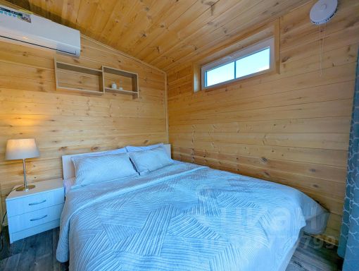 В доме есть отдельная спальня с двуспальной кроватью, кухня-гостиная с высокими потолками и панорамными окнами, видом на лес, санузел и душевая