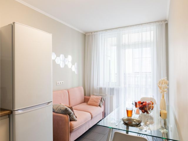 Полностью укомплектована необходимой мебелью и техникой: кофе машина, плитка индукция, микроволновка, холодильник, утюг, стиральная машина, большой телевизор, чайник, фен, гладильная доска, сушилка для вещей.