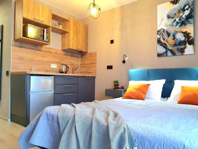 Зона кухни снабжена холодильником с морозильной камерой; электрической варочной панелью, простой в управлении; микроволновой печью для разогрева блюд и разморозки продуктов; электрическим чайником.