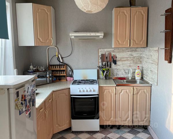 На кухне - кухонный гарнитур. Плита - газовая, с рабочей духовкой. Холодильник.