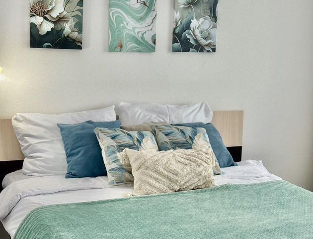 * Роскошная двуспальная кровать с ортопедическим матрасом, заправлена чистым бельем.