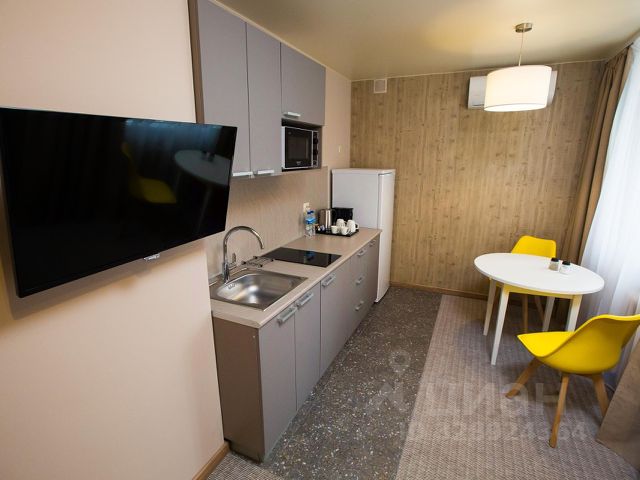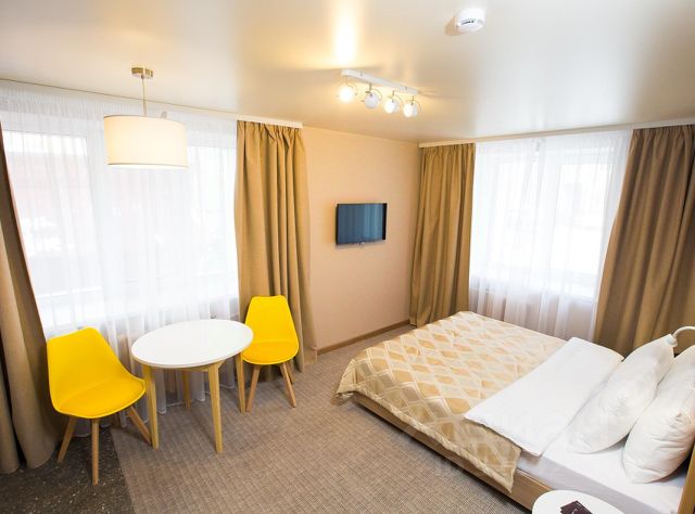 Однокомнатные апартаменты со спальней и полноценной кухней. Площадь номера 25 м² В номере: большая двуспальная кровать 160х200 с прикроватными столиками; кухонная зона (обеденный стол, холодильник, микроволновая печь, варочная панель, кухонные принадлежности); ванная комната (ванна, фен, комплект полотенец, халат, косметические и гигиенические принадлежности); шкаф для одежды; телевизор; кондиционер; гладильный центр; сейф; телефон; чайная станция (бесплатно: чай, бутилированная вода, сахар, натуральный кофе, сливки); мини-бар (платно). Снять квартиру-студию посуточно в Карпинске.