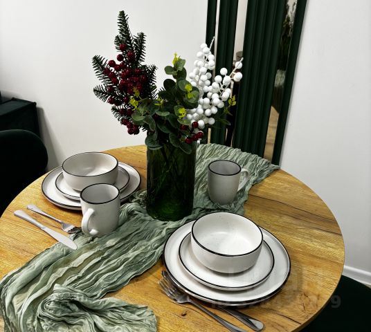 • Кухонный гарнитур, обеденный стол и стулья, удобный раскладной диван, письменный стол, посуда.