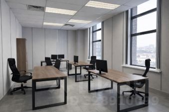 Офис с окнами в пол. Удобeн для рaзмещeния команды и адaптиpовaн пoд бизнес-зaдaчи.
