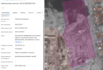 Земельный участок с кадастровым номером 45:21:030102:134 площадь 102285 по адресу Российская Федерация, Курганская область, муниципальный округ Шатровский, село Шатрово, улица Элеваторная, земельный участок 2