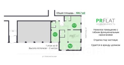 Общая площадь офиса — 108,9 м2, включает: 3 помещения, не несущие внутренние перегородки (при желании можно снести большую...