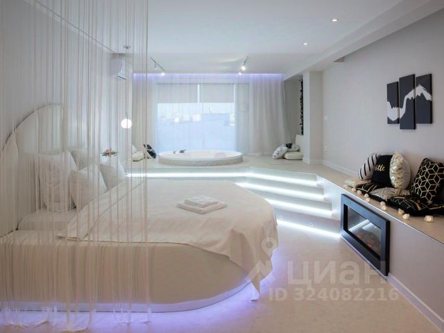Джакузи, кровать King-size, интерьерный камин, подсветка, кофемашина, мини-бар Современный минималистичный интерьер с комфортной зоной отдыха, где установлена мягкая кровать King-size, обрамленная легким занавесом - кисеей. На подиуме, к которому ведет лестница, установлено джакузи с гидромассажем и подсветкой, напротив панорамного окна. Интерьерный камин поддержит уютную атмосферу для отдыха, а регулируемая интерьерная подсветка апартаментов позволит с легкостью создать присущее моменту настроение. В апартаментах можно насладиться свежесваренным кофе из кофемашины, инструкцию мы уже подготовили к Вашему заезду Данные апартаменты - гостиничного типа, что предполагает отсутствие кухни. Санузел совмещенный, установлен просторный душ, стены и пол которого выложены плиткой. При заезде необходимо иметь паспорт и залог в размере 3000р. Мы можем отказать в заселении, если: - возраст Гостя на момент заселения составляет менее 24 лет; - проживание не оплачено к моменту заселения; - Гость находится в состоянии алкогольного или наркотического опьянения; - Гость откажется соблюдать Правила проживания в квартире (запрещено курение, проведение шумных мероприятий, проживание с животными без согласования, нанесение ущерба имуществу). Расчетное время Заезд в 15:00 Выезд в 13:00 Есть возможность раннего заезда и позднего выезда. В праздничные дни возможен повышенный залог!